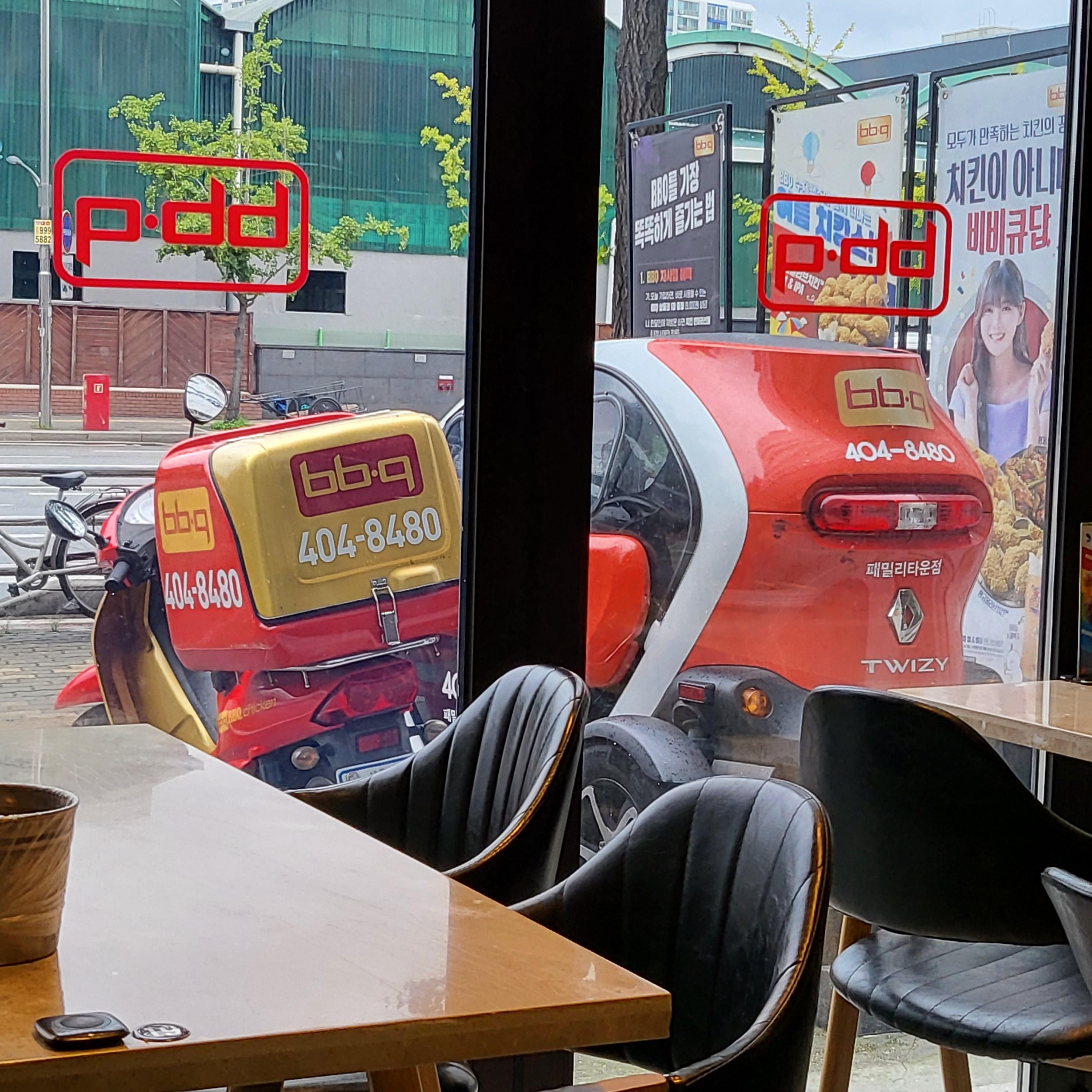 유리창 밖을 보니 배달 오토바이와 배달 소형 전기차가 나란히 보이는군요.